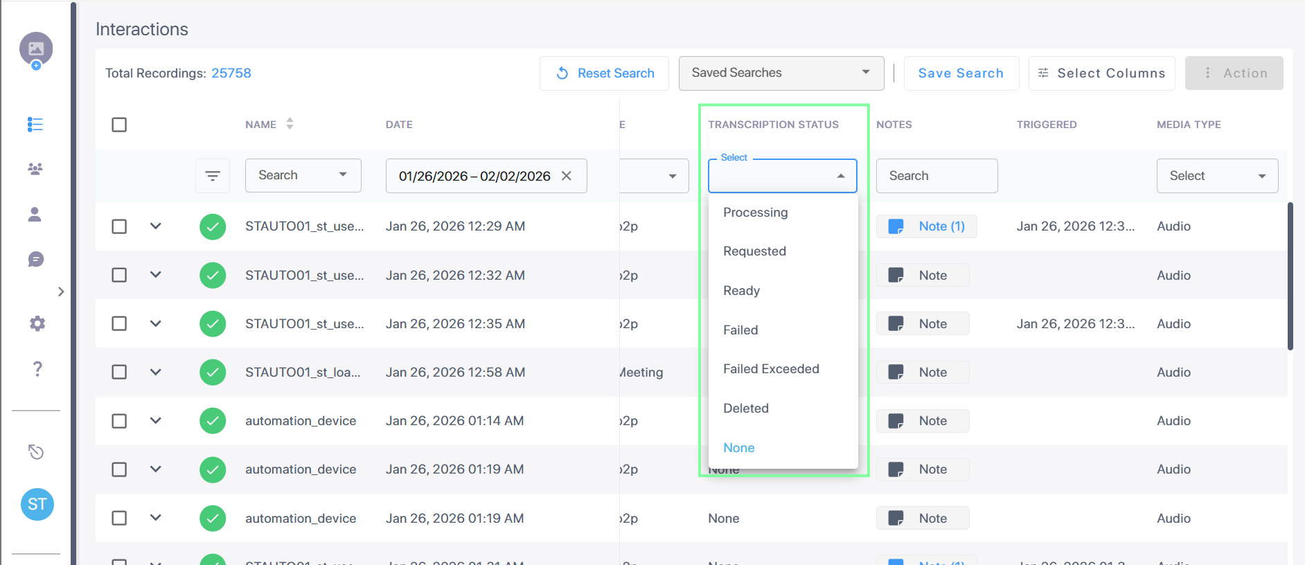 | 2. | From the Transcription Status drop-down, select a transcription status, or select None for calls without transcription. |