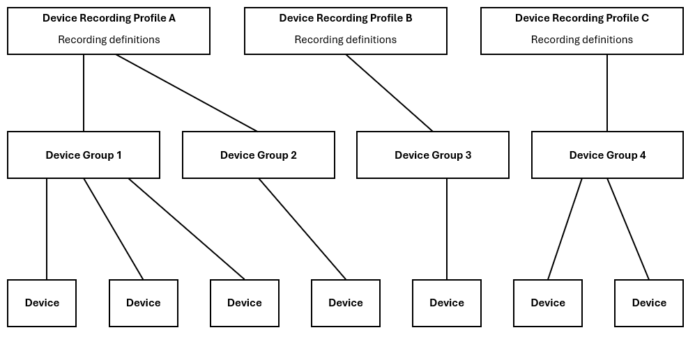 Together, these elements determine which devices are recorded and what recording rules apply to them. The profile defines the recording rules; the devicegroup determines which devices inherit them.