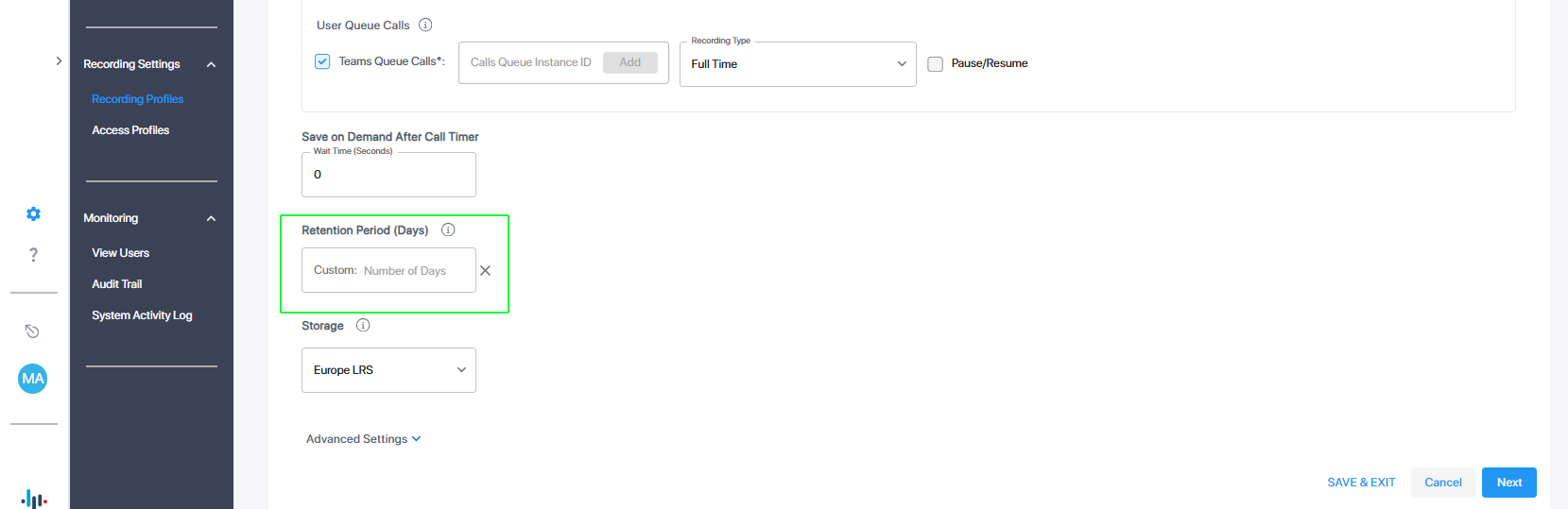 Unlimited” retention is a new service offering that enables customers to pay per user per month for all recording users in the tenant. Until now data retention was limited to 24 months. The Number of Days to retain data can be configured using the Custom value for the Retention Period (Days) setting in the Recording Profile. This feature must be enabled in the Tenant service in the Tenant Management interface.