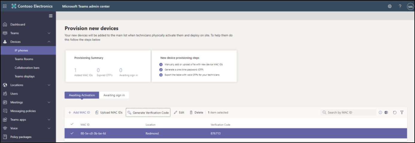 Network admins can remotely provision and sign in to a Teams device. To provision a device remotely, the admin needs to upload the MAC IDs of the devices being provisioned and create a verification code. The entire process can be completed remotely from the Teams admin center.
