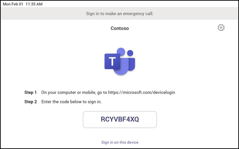 Once the device is powered up and connected to the network, the technician provisions the device by choosing the ‘Settings’ gear on the top right of the new ‘Sign in’ page and selecting Provision phone.