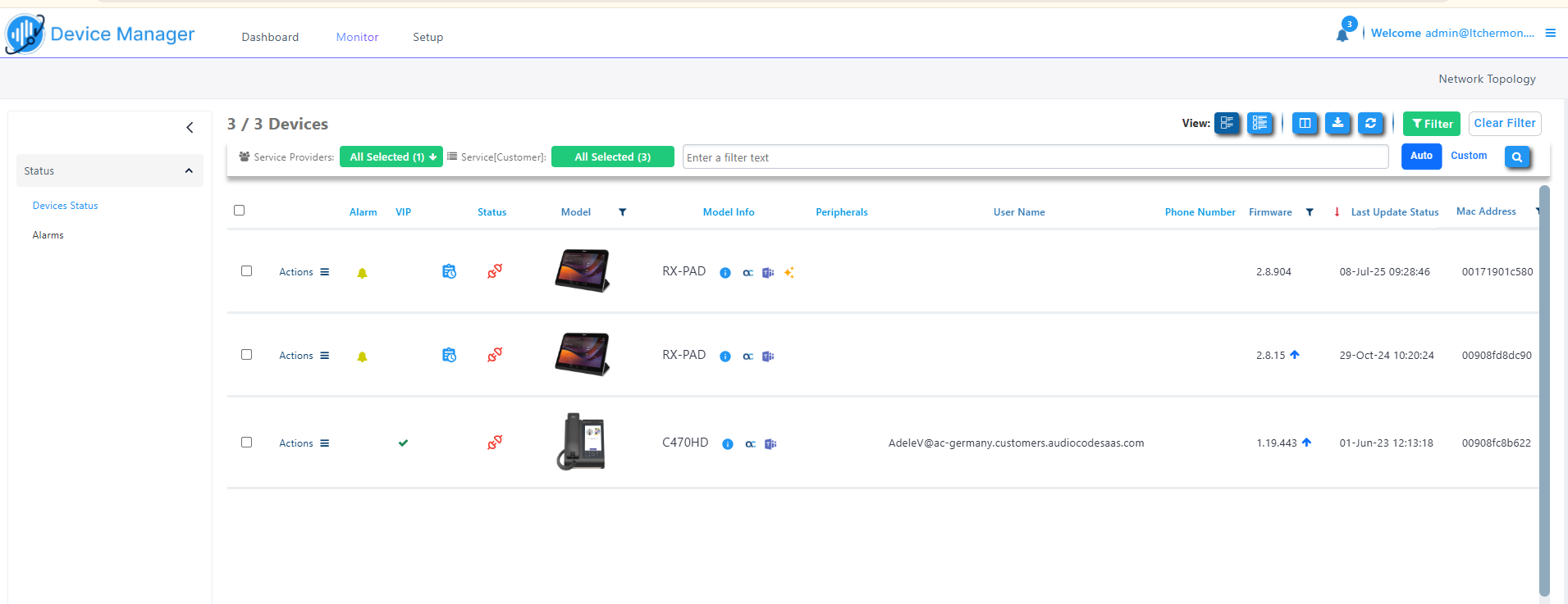 Pie chart showing the number of devices per service provider that are registered. Hover over a segment of the pie to view the service provider's name and the number of devices registered under it. Click a segment of the pie to open the Devices Status page displaying that service provider and the devices registered under it. |