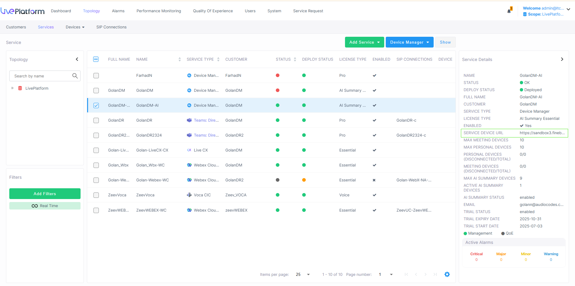 | 13. | In the Live Platform Operation Center Services page, view the Service Details and note that the AI Summary Status feature is enabled. |