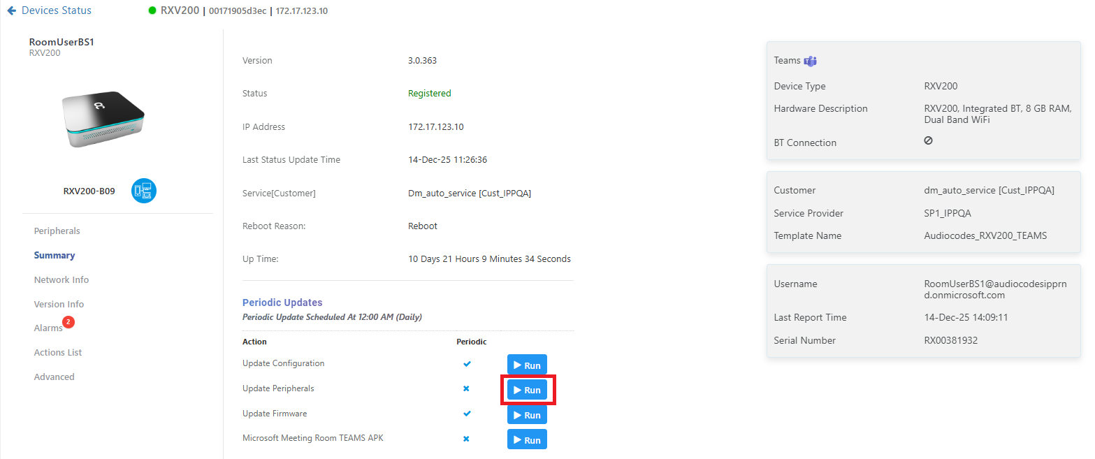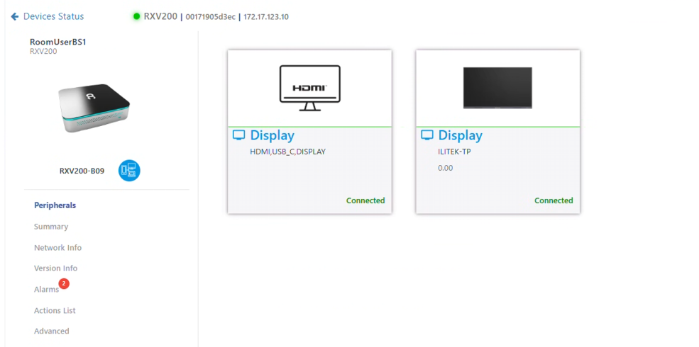 Admins can monitor and maintain the Touch Screen Camera in their networks using Device Manager. RXV200-B09 is a peripheral that is bundled either with RXV200 Windows MTR or RXV200 Android MTR. For more information about RXV200-B09, see AudioCodes website.