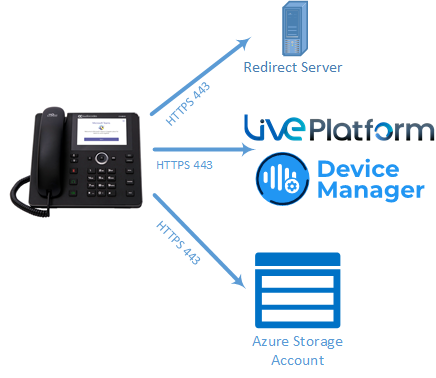 Endpoints deployed in the enterprise sites traverse the public internet to connect to the Redirect Server, Live Platform Device Manager and Azure Storage account over HTTPS port 443.