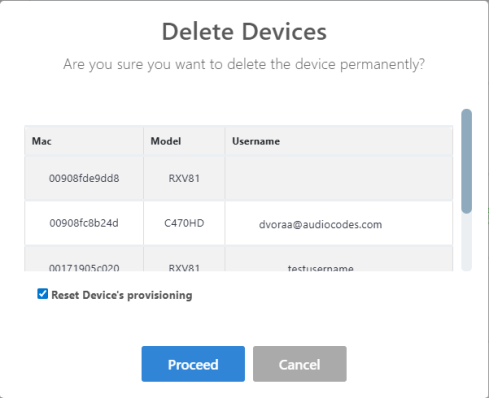 Select the Reset Device's provisioning checkbox and click Proceed. The devices are deleted. |