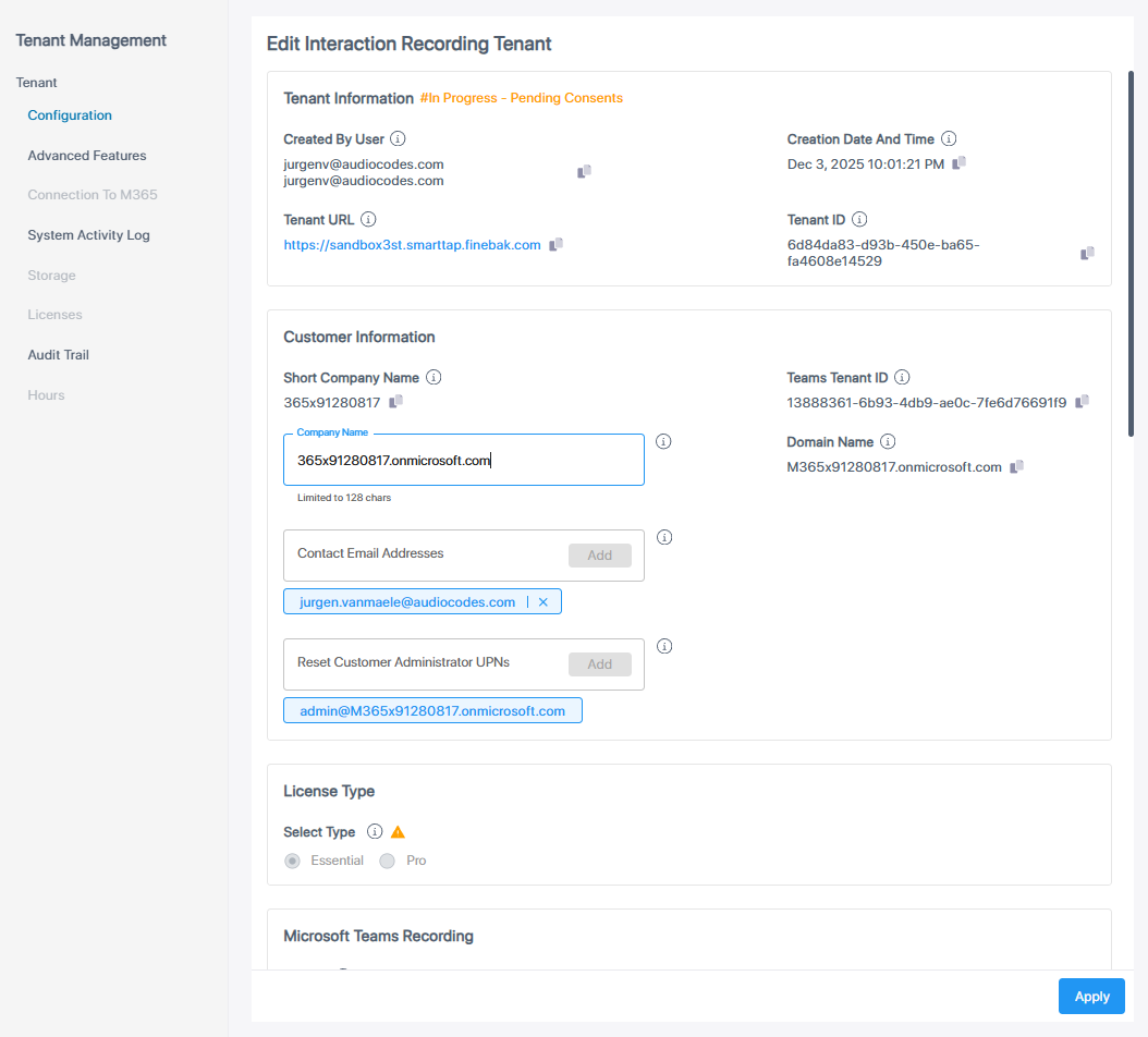 | 2. | Modify Configuration settings (see Onboarding Interaction Insights Services for details) and then click Apply. |