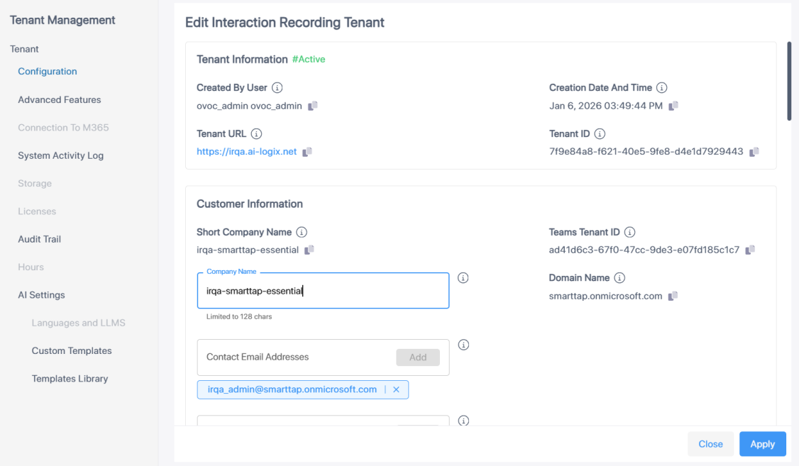 | 2. | Modify Configuration settings (see Onboard Interaction Insights Services for details) and then click Apply. |