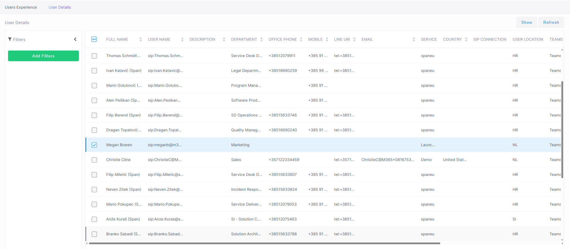 The User Details page includes a list of all customer tenant operators defined in their Azure Active Directory. Usernames and passwords of the customer users are by default locally stored in the AudioCodes Customer portal application's database. .The page mirrors the Customer Azure Active Directory. Any change to the AD is reflected in the User Details page immediately after synchronization is performed.