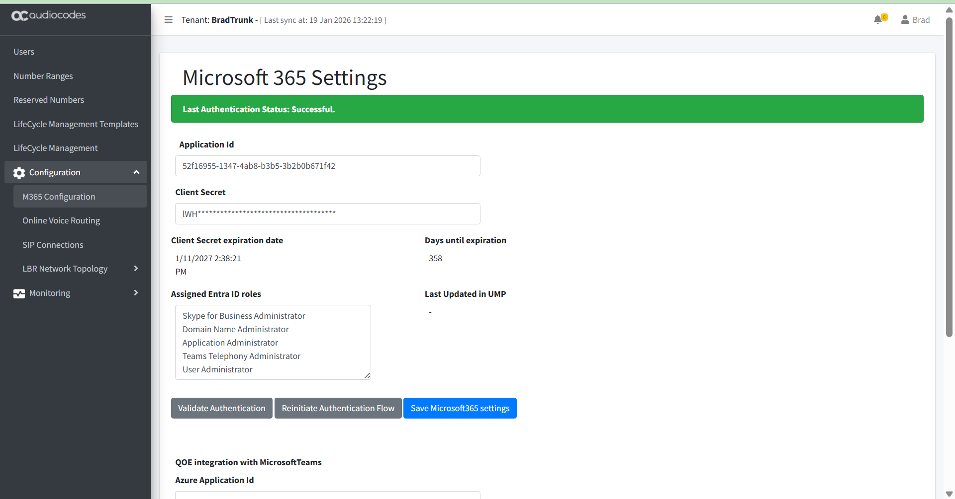 5. If you created a QOE application registration for enabling QOE Integration with Microsoft Teams, enter the details of the Application registration (see Add Microsoft Teams Device (Direct Routing).