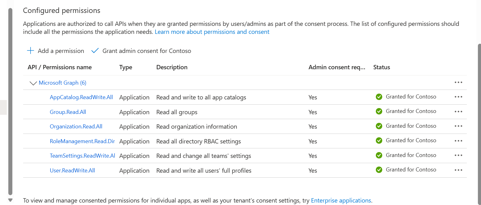 9. In the Navigation pane, select Manage > API permissions. View the new permissions created by the automatic script.