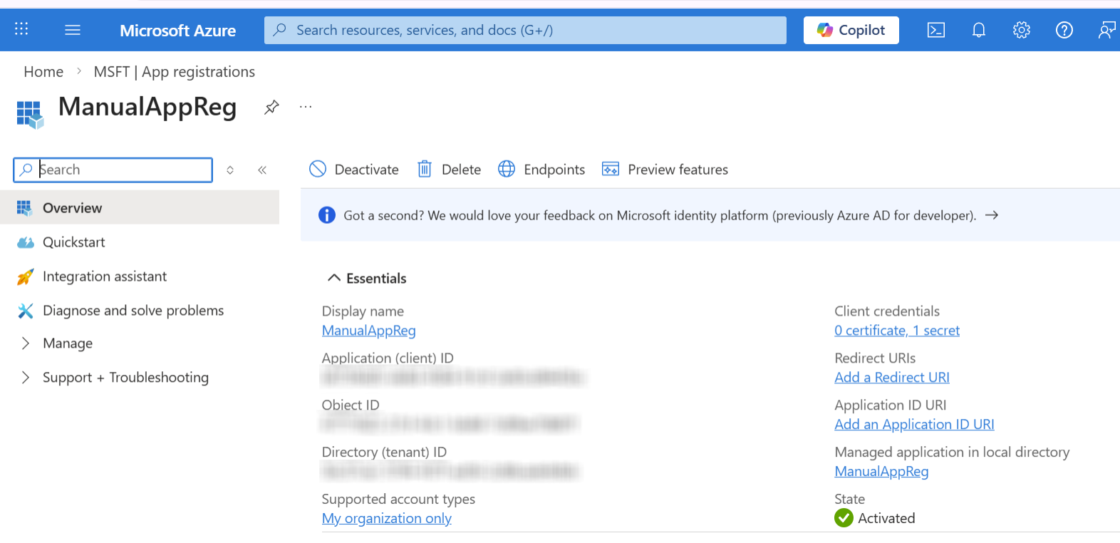 In the Overview page, Copy the Tenant ID and Application (client) ID value. |