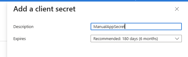 Enter the Description for the secret and the Expires date (recommended 12 months) and then click Add. |