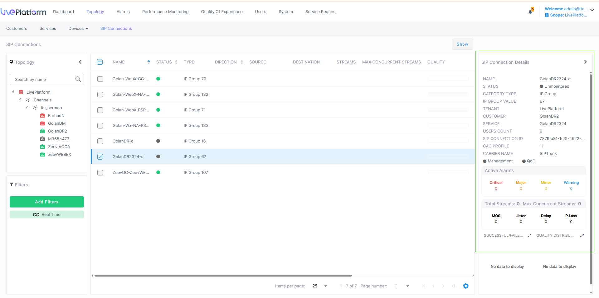 The SIP Connection Details pane enables you to view current statuses, active alarms and current stream capacity. You can also drill down to view Active alarms page, Successful/Failed Calls and Quality Distribution.