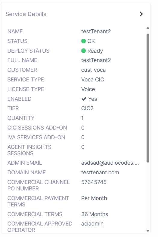 The Voca CIC device (sub region) attached to the tenant in the Services tab of the tenant details.