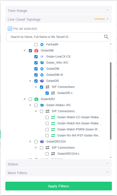 Once you define filter criteria for a specific entity, the respective sub-entities are also filtered. In the example below, the Live Platform Topology is filtered for customer 'BB12745'. The Services page is filtered accordingly, displaying only those services that are deployed under customer 'BB12745'. In addition, other pages includes Alarms, Performance Monitoring, QoE data, Calls List and Users pages are filtered accordingly.