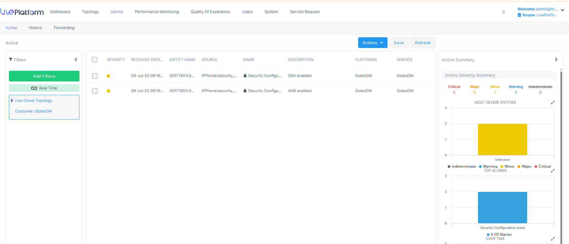 The figure below shows the filtered Alarms page according to the Customer filter criteria.