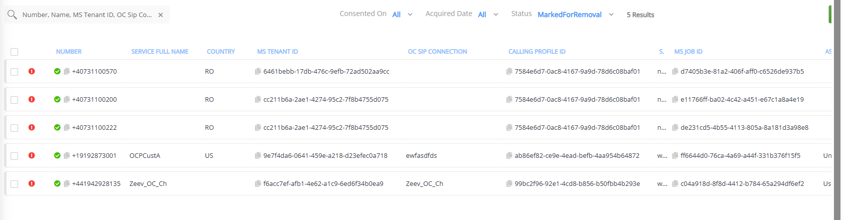 When a number is deleted by Teams admin center, the OC Number Management page displays the number with the "Marked for Removal" icon. When you approve deletion, the number is displayed with the "Ready for Removal" icon, indicating that Live Platform is currently processing the deletion. Typically, the deletion process is almost immediate and therefore, this status stage is skipped.