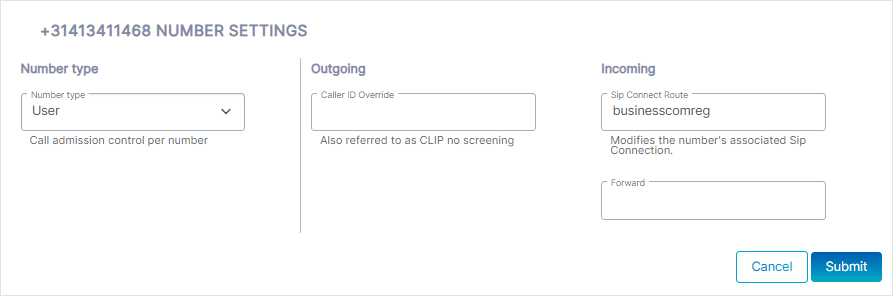 Name of the SIP Connection for which incoming and outgoing calls for this number are connected.
