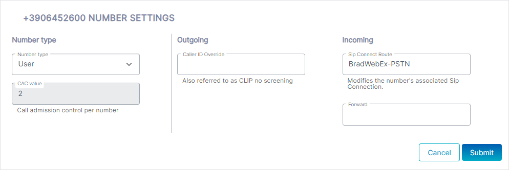 CAC Values: Configure CAC value for Contact Center and Service Numbers which limits the number of concurrent call sessions for the number (not relevant for the 'User' number type). |