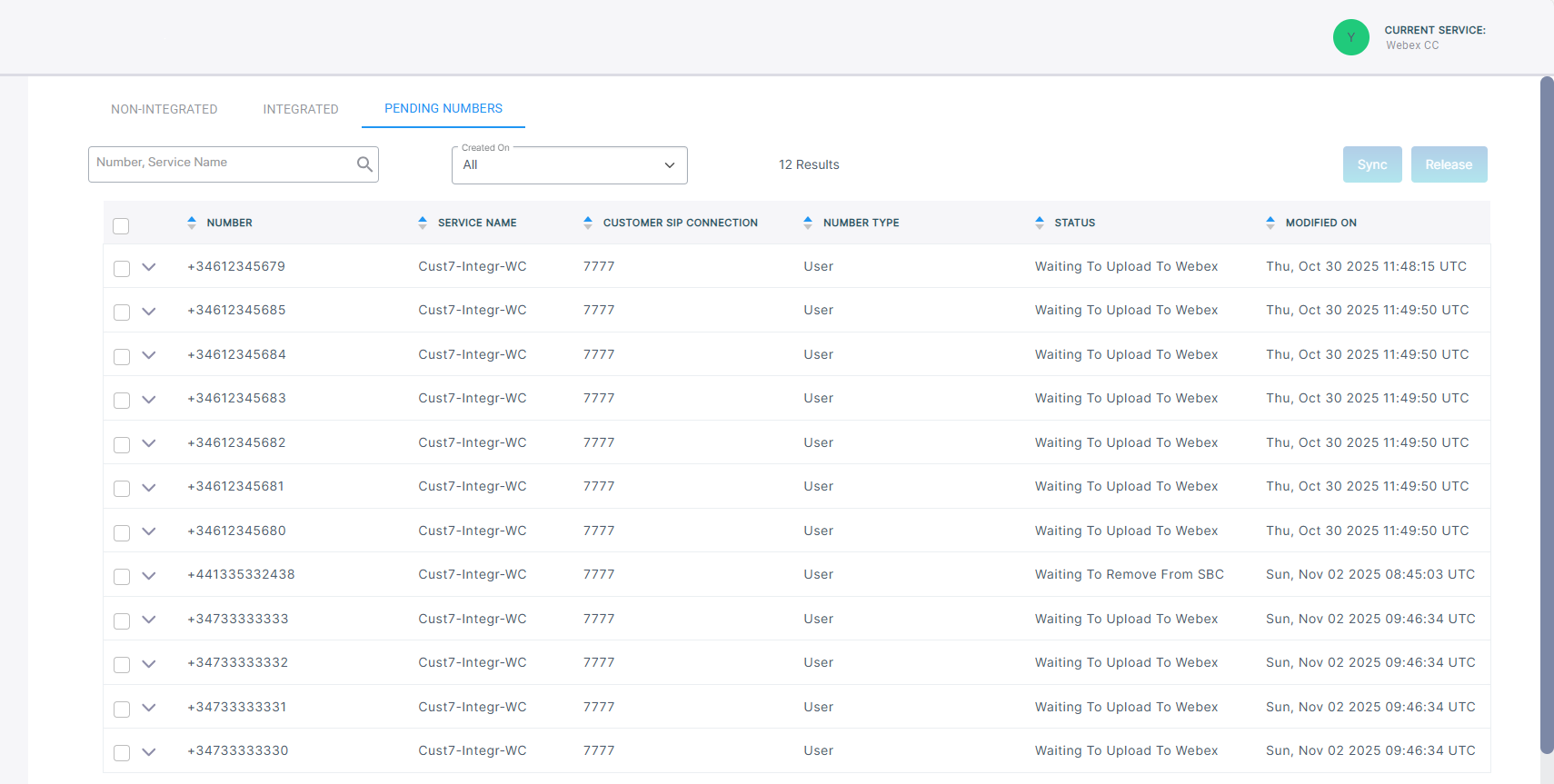 Integrated: Numbers loaded to Live Platform are automatically synchronized with the relevant site location of the Webex Cloud Connect organization. Synchronization is performed over a secure token connection that is established through the email invitation link that is sent to the customer admin account during the Onboarding phase (see Onboarding the Integrated Service).