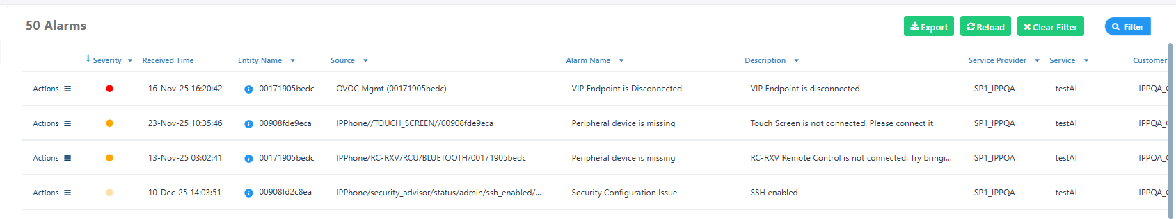 The Alarms page lets you monitor active alarms raised on your managed endpoints. Based on these alarms, you can correct failures before users encounter them, maintaining high productivity and business without interruption.
