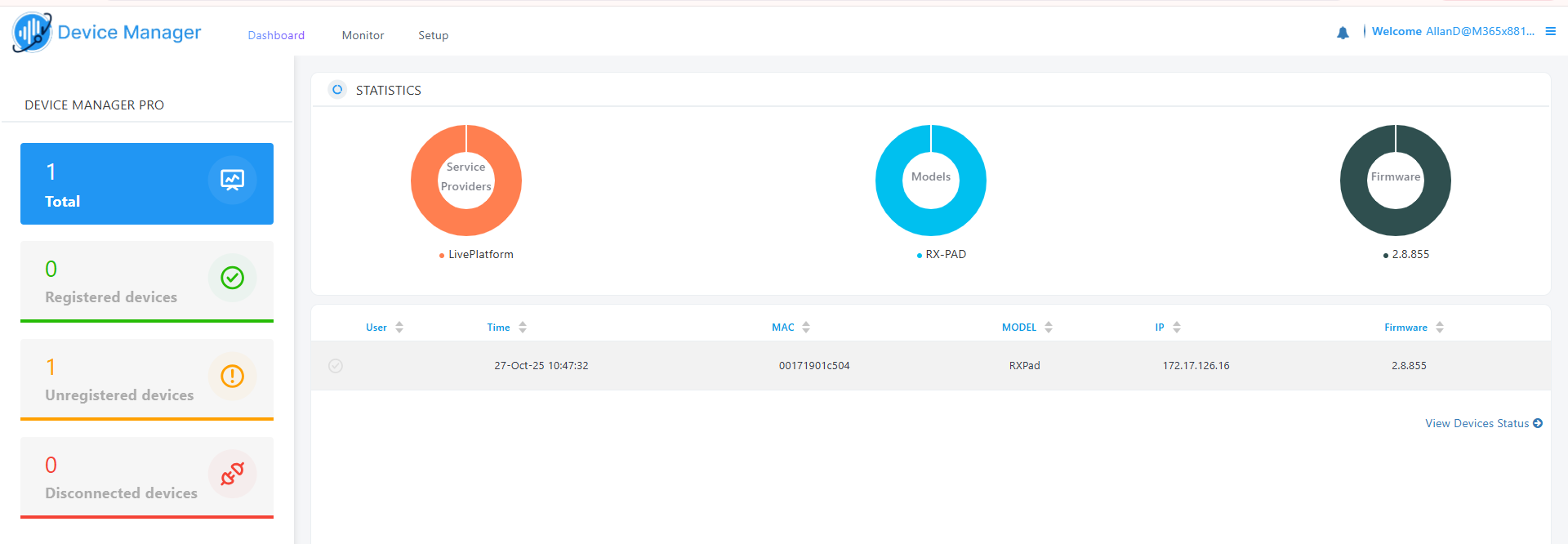 Pie chart showing the number of devices per service provider that are registered. Hover over a segment of the pie to view the service provider's name and the number of devices registered under it. Click a segment of the pie to open the Devices Status page displaying that service provider and the devices registered under it. |
