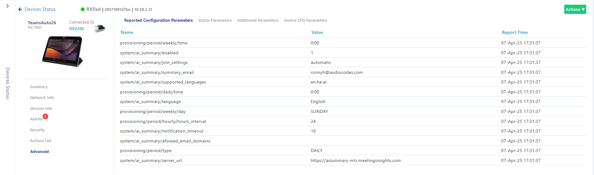 In the left pane of the page shown in the preceding figure, view the device's version, status, IP address, Last Status Update Time, Site, Reboot Reason and Up Time. In the right pane, view Teams device information such as Tenant, Template Name and Serial Number. In addition, you can access the Actions drop-down menu. |