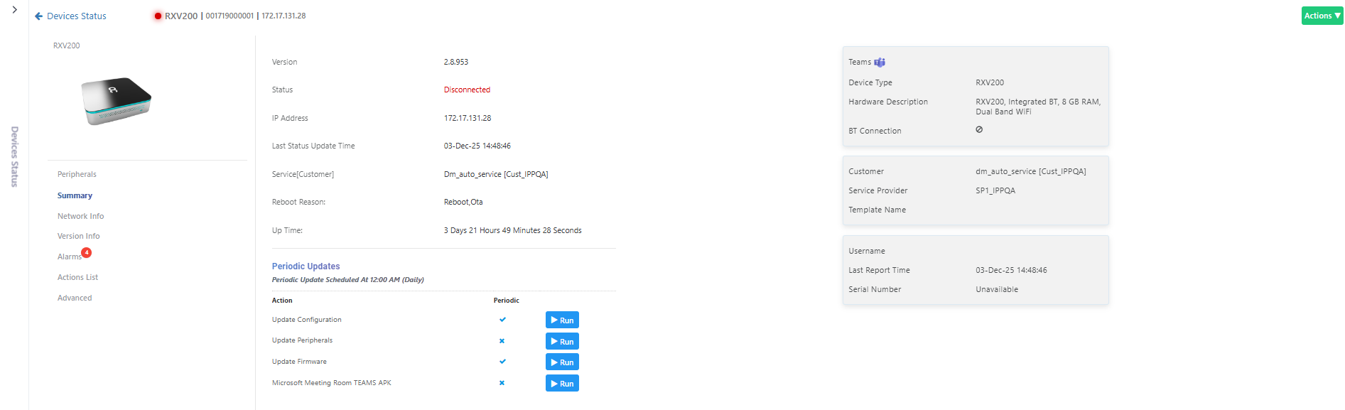 4. In the left pane of the page shown in the preceding figure, view the device's version, status, IP address, Last Status Update Time, Site, Reboot Reason and Up Time. In the right pane, view Teams device information such as Tenant, Template Name and Serial Number. In addition, you can access the Actions drop-down menu.