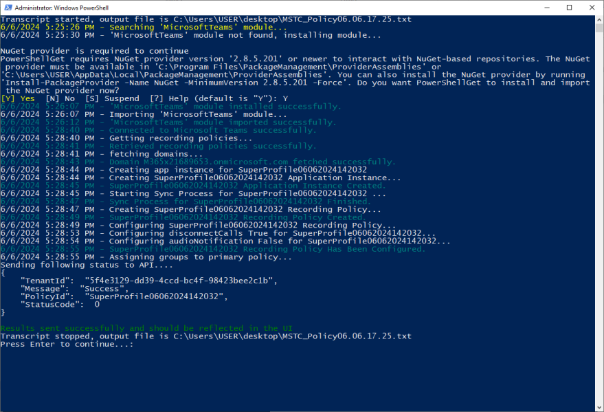 Once the script has successfully completed, a confirmation message is displayed in the PowerShell console as shown below.