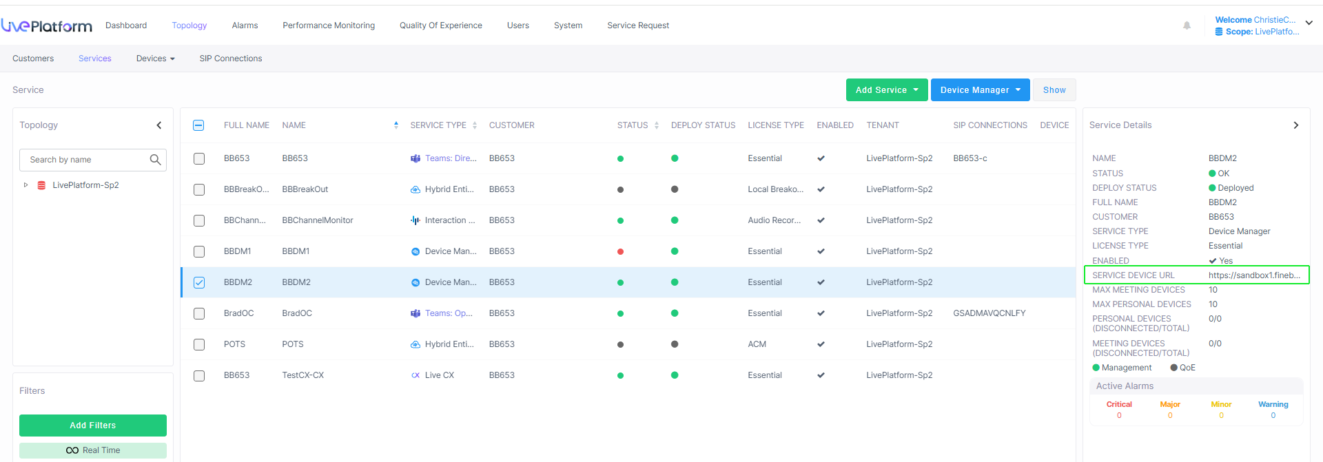 1. In the Services page, select your , copy the Service Device URL. For example: https://<Live Platform Server FQDN>.com/ltcfordevice/c/<customerAzureId>/
