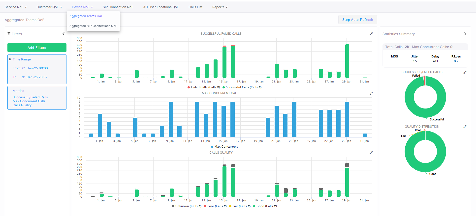 Data categories retrieved includes the Successful/ Calls, Maximum Concurrent Streams, and the Streams Quality. The Statistics Summary pane lets you quickly assess the voice quality metrics and the call quality distribution for the deployed service. Statistics are aggregated separately for the SBC call leg (SIP Connection) and the Teams call leg for the following entities: