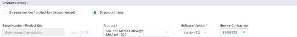 | ■ | By Product Name: Use this option if you do not know the Serial Number of the device. Without the Serial Number or Service Contract number, support may be limited, but please provide the product details as shown in the following figure. You will be able to submit a ticket without entering the Service Contract Number if you do not have the Service Order number available at the time of submitting the ticket. |