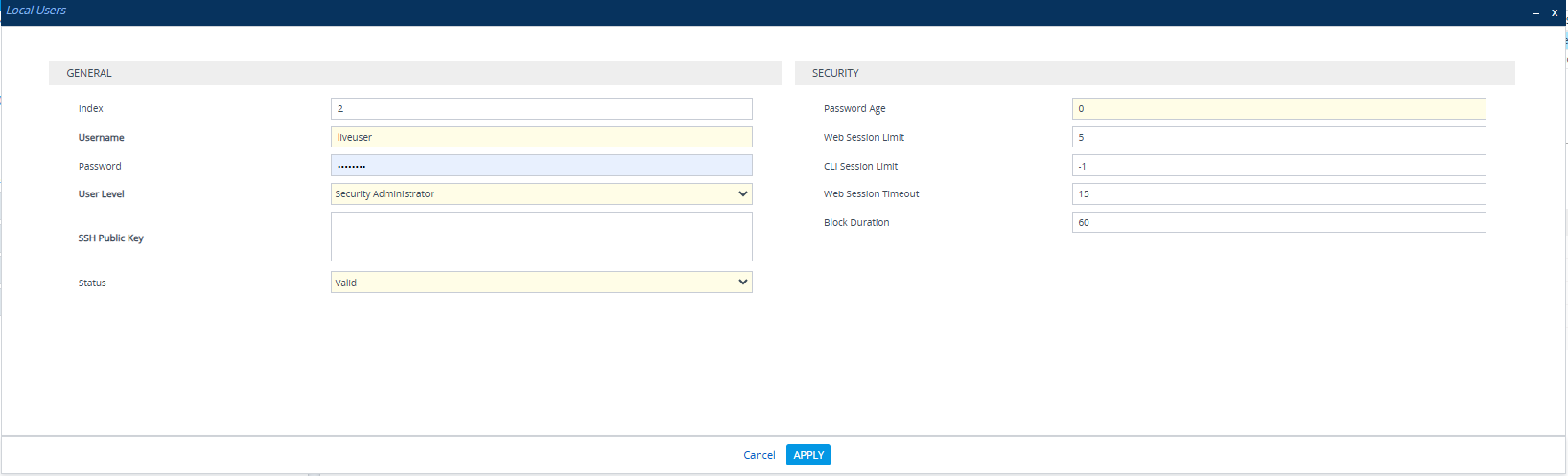 Create a new Security Admin user for Live Platform: Navigate to Setup >Administration > Local Users (save credentials for configuration in Connecting Devices to Live Platform) and configure the following. |