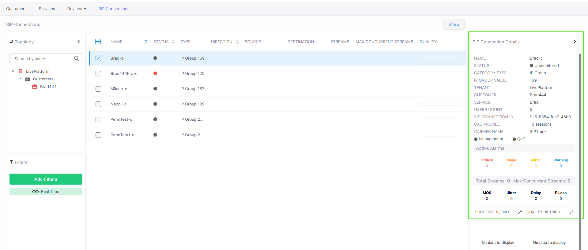 The SIP Connection Details pane enables you to view current statuses, active alarms and current stream capacity. You can also drill down to view Active alarms page, Successful/Failed Calls and Quality Distribution.