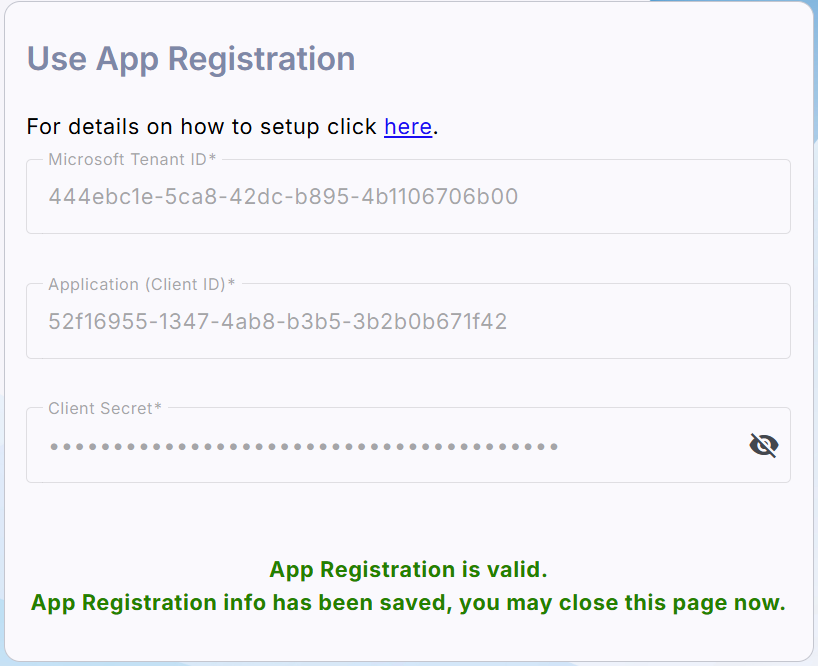 A confirmation message is displayed that the Application Registration is valid. Close the window. |