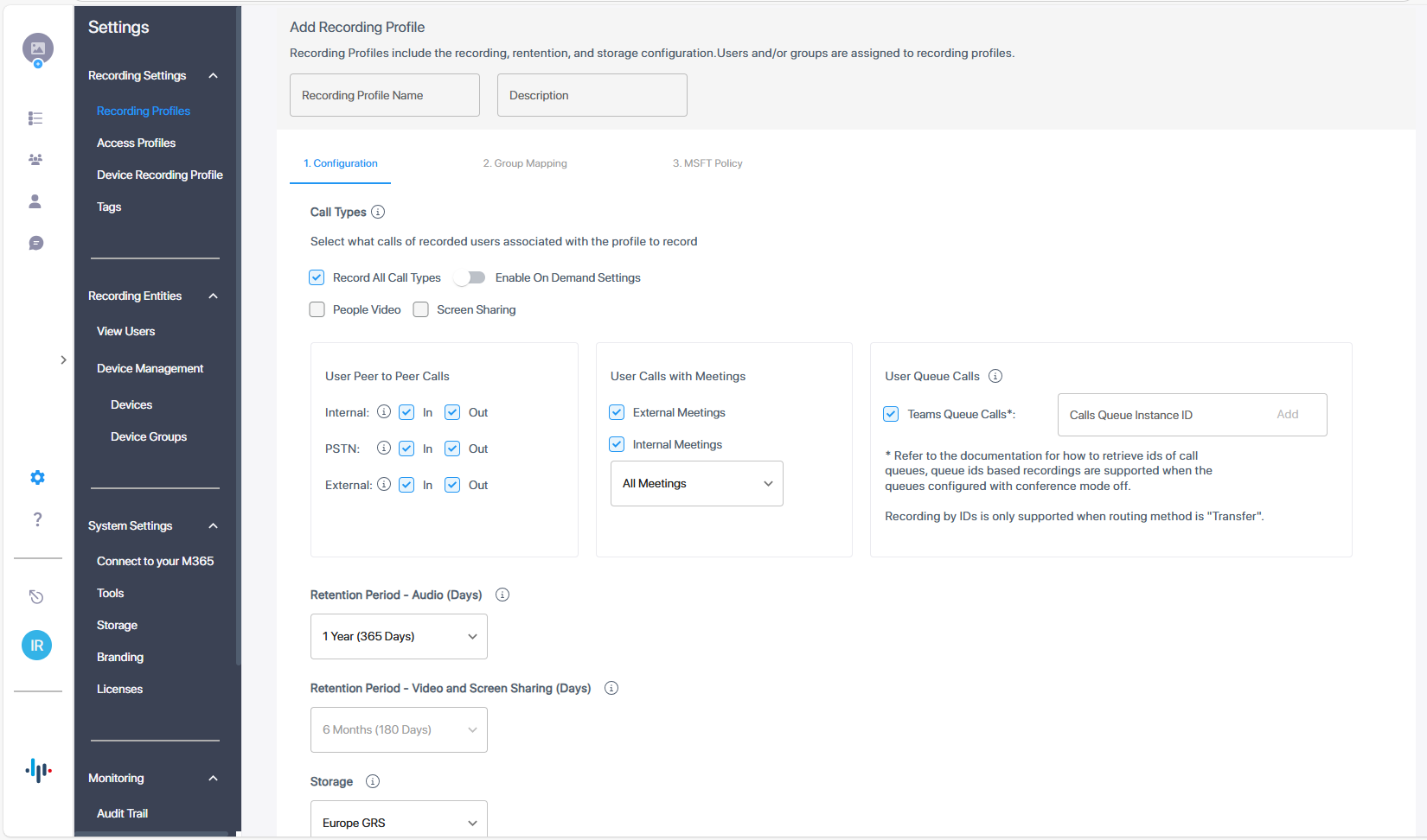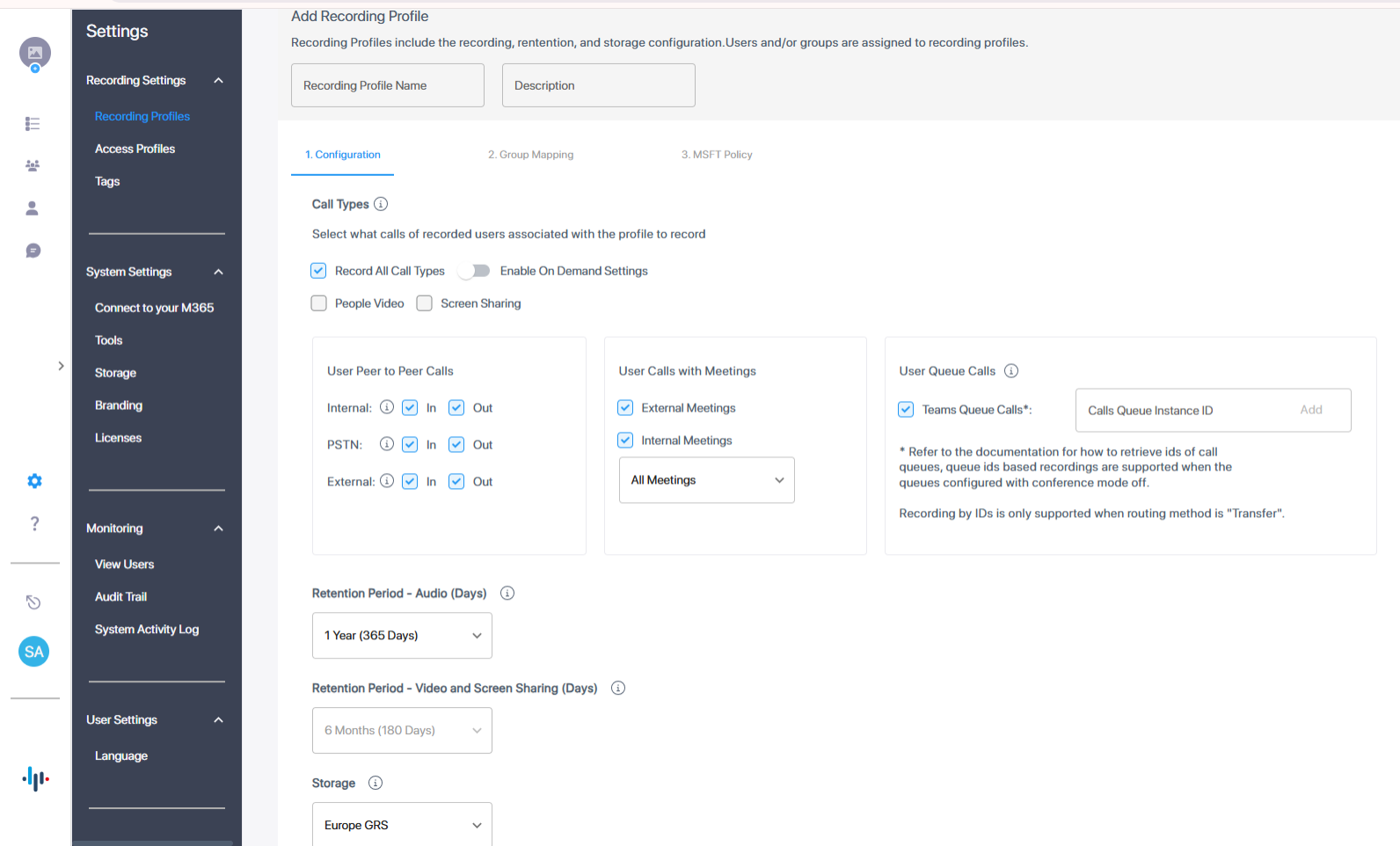 The Quick Start wizard process created an initial Recording profile for your tenant. You can then add additional recording profiles for targeted users.