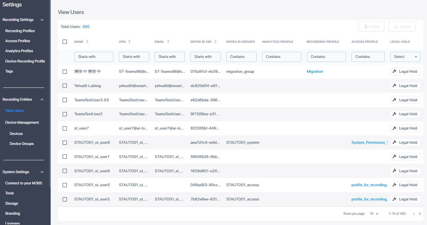 This page displays users belonging to M365 groups assigned to Recording or Access profiles or who were previously assigned and have been unmapped for whatever reason. You can search and sort users according to their associated profiles and groups and place users on Legal Hold.