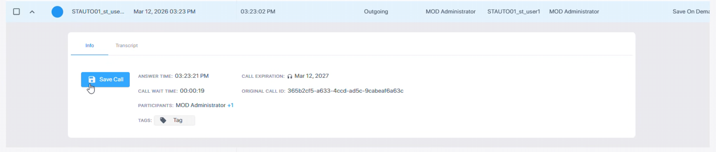 The Save option is available until the call ends, or for a period after the call, as specified in the recording profile. During that period, you can also save the recording on the Interactions page: