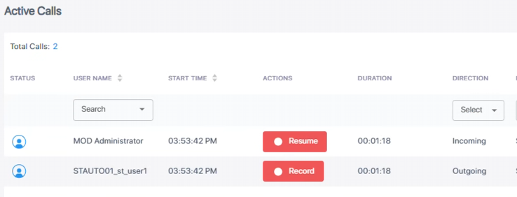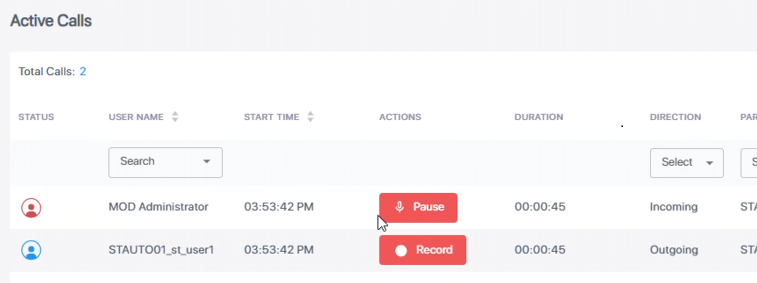 If the recording profile is set up for on-demand recording, a Record button appears for the active call in the Actions column. Click it to start recording the call.