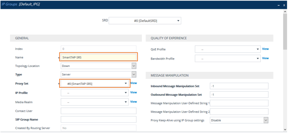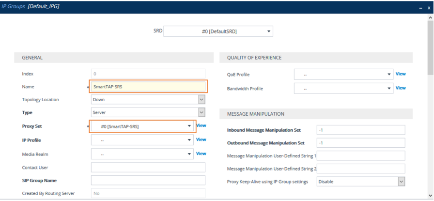 Configure the SRS entity, which is represented by the SBC as an IP Group configuration entity. The address of the IP Group is determined by the Proxy Set that you configured in the previous step. |