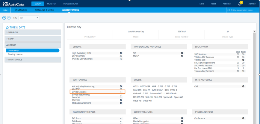 SIPREC functionality is a licensed feature. Therefore, prior to configuring the SBC for SIPREC, make sure that its license key contains the SIPREC license feature.