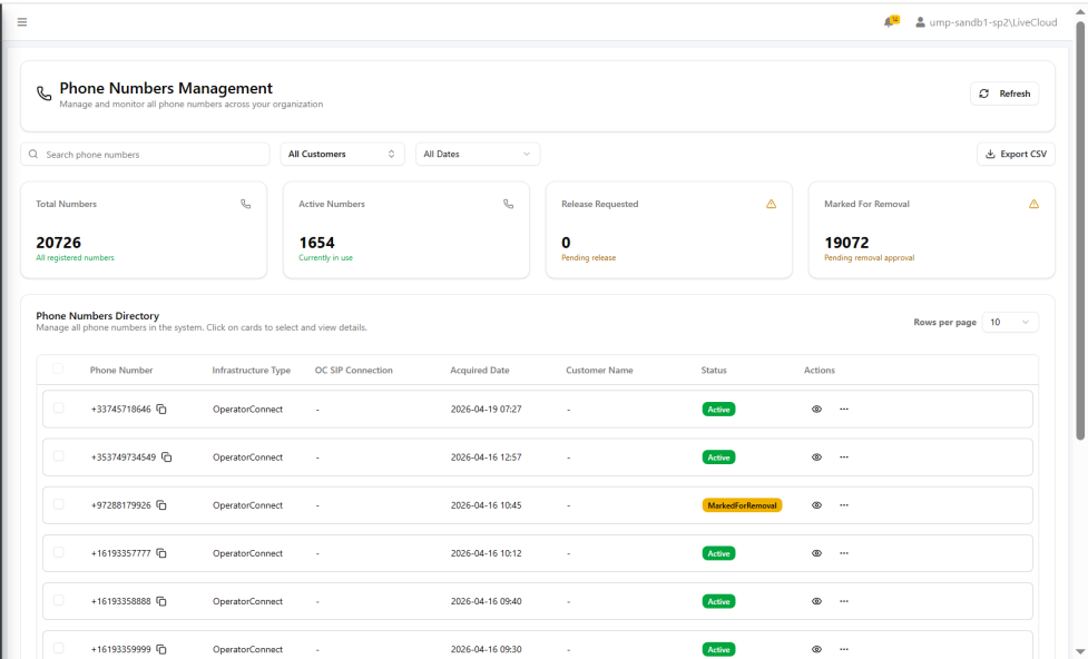 The Operator Connect menus in the Multitenant portal have been updated for the ARM integration with a new look and feel. The upper panes provides a quick glance summary for number data and statuses. The lower pane includes the phone directory for number statuses.