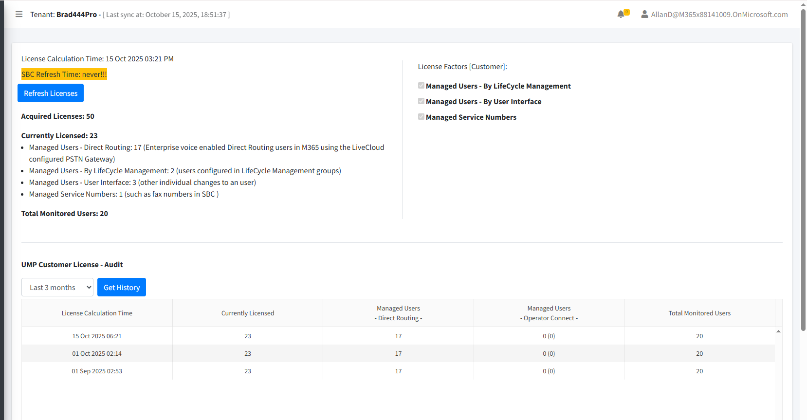 The UMP-365 User License screen in the Service portal monitors the currently assigned user licenses for each tenant based on their purchased available license pool. Customers are then billed for license usage based on the aggregated data attributed to the configuration actions performed in Day Two upon the managed users. The license calculation is based on the following:
