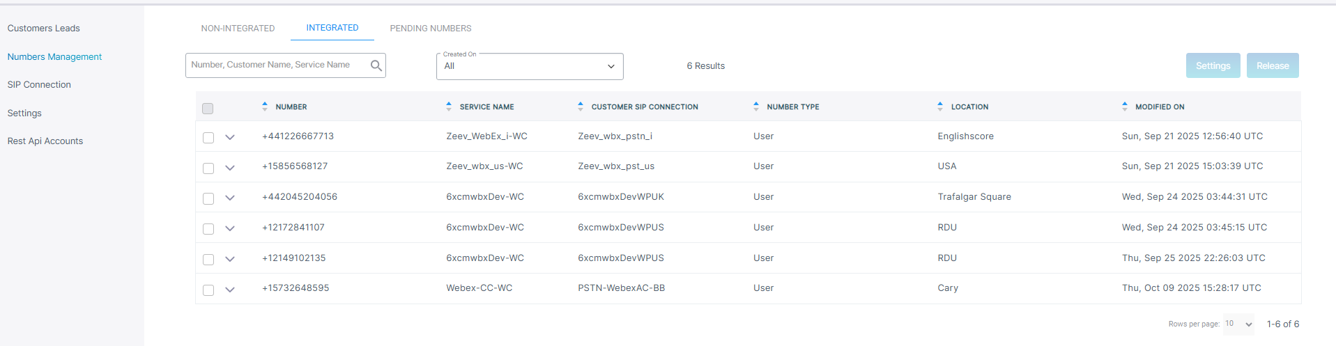The Onboarding form includes a new 'Integrated' option to send a Token Invitation email to the customer tenant admin account to secure the connection between Live Platform and Webex Control Hub. Once the connection is established, locations added on Webex Control Hub are synced to Live Platform. The service provider or channel reseller can then attach one of the synced locations to the customer, add the SIP connections and then upload numbers. The uploaded numbers are then also synchronized to the relevant site location on Webex Control Hub. The Onboarding form also includes a 'Non-Integrated' option for managing both platforms separately without synchronization. The uploaded numbers are divided into separate tabs, 'Non-Integrated' and 'Integrated' according to the Onboarding configuration.