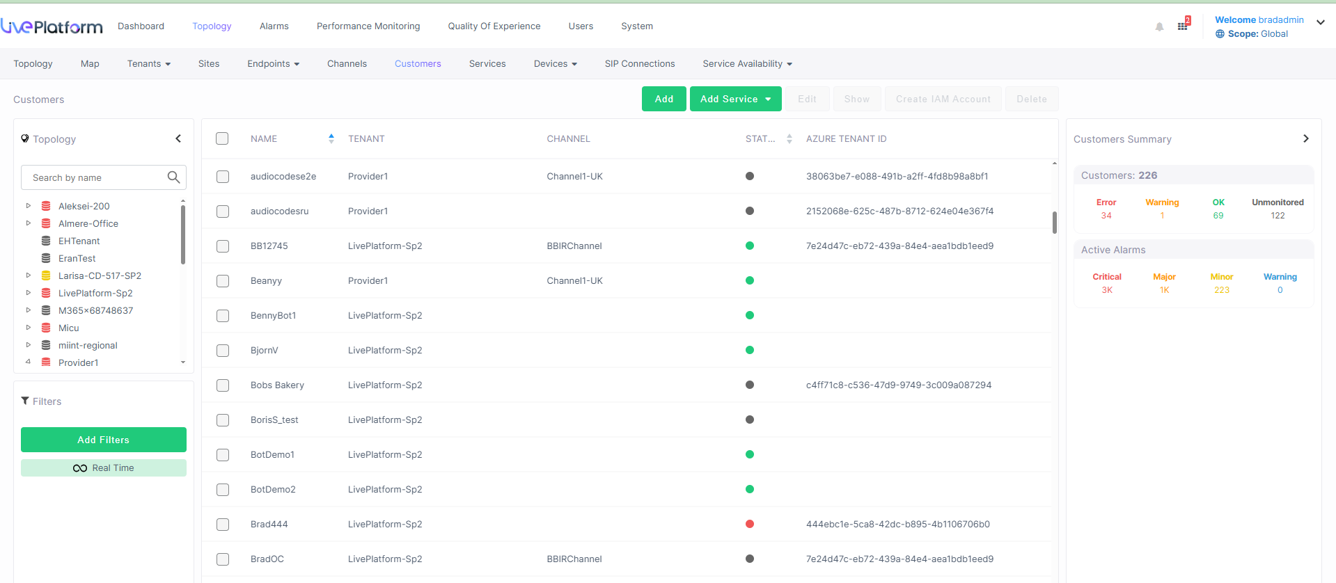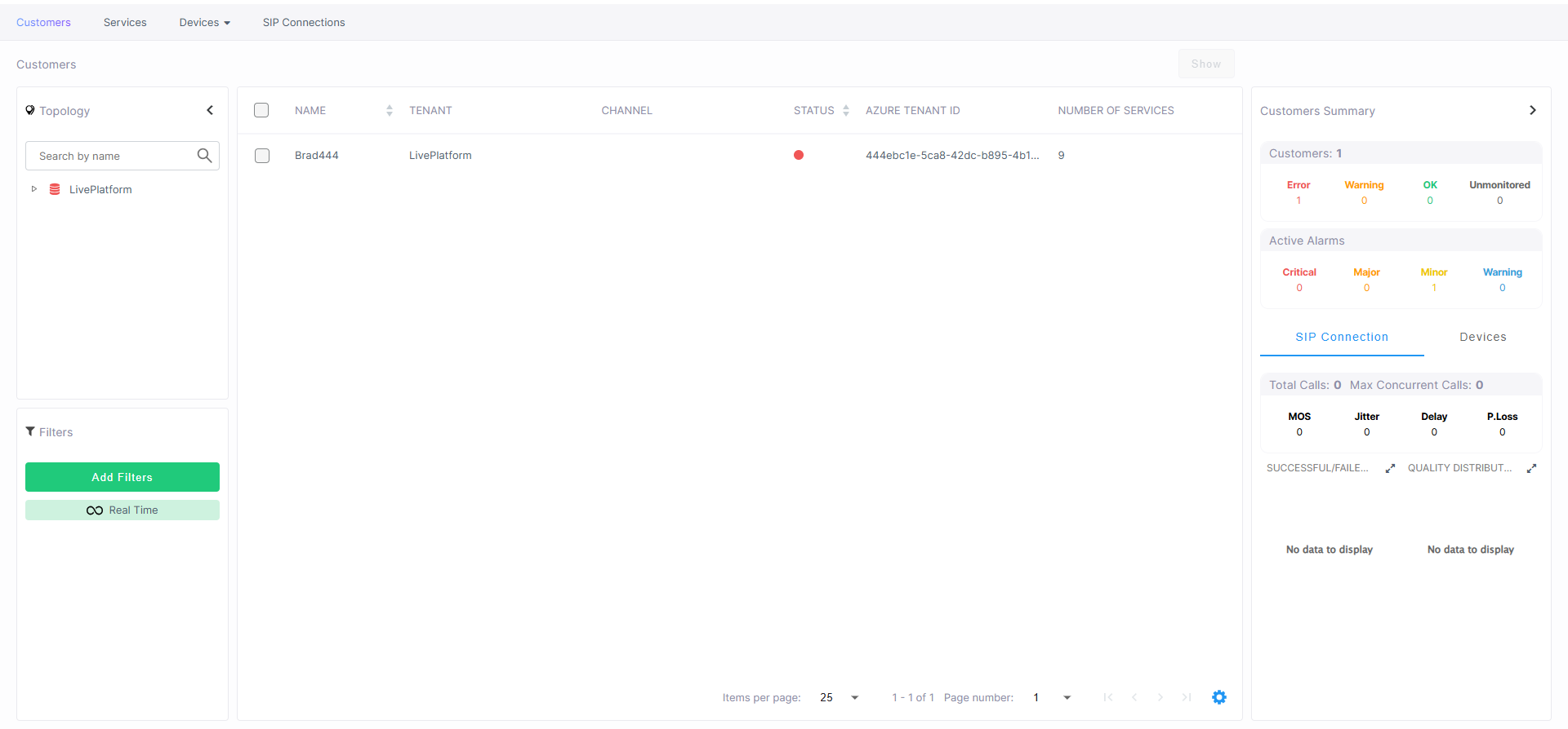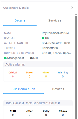The Customers page lets you view the details of your Live Platform parent entity. The Customer Summary lets you drill down to view the details of the services that are deployed for the customer.