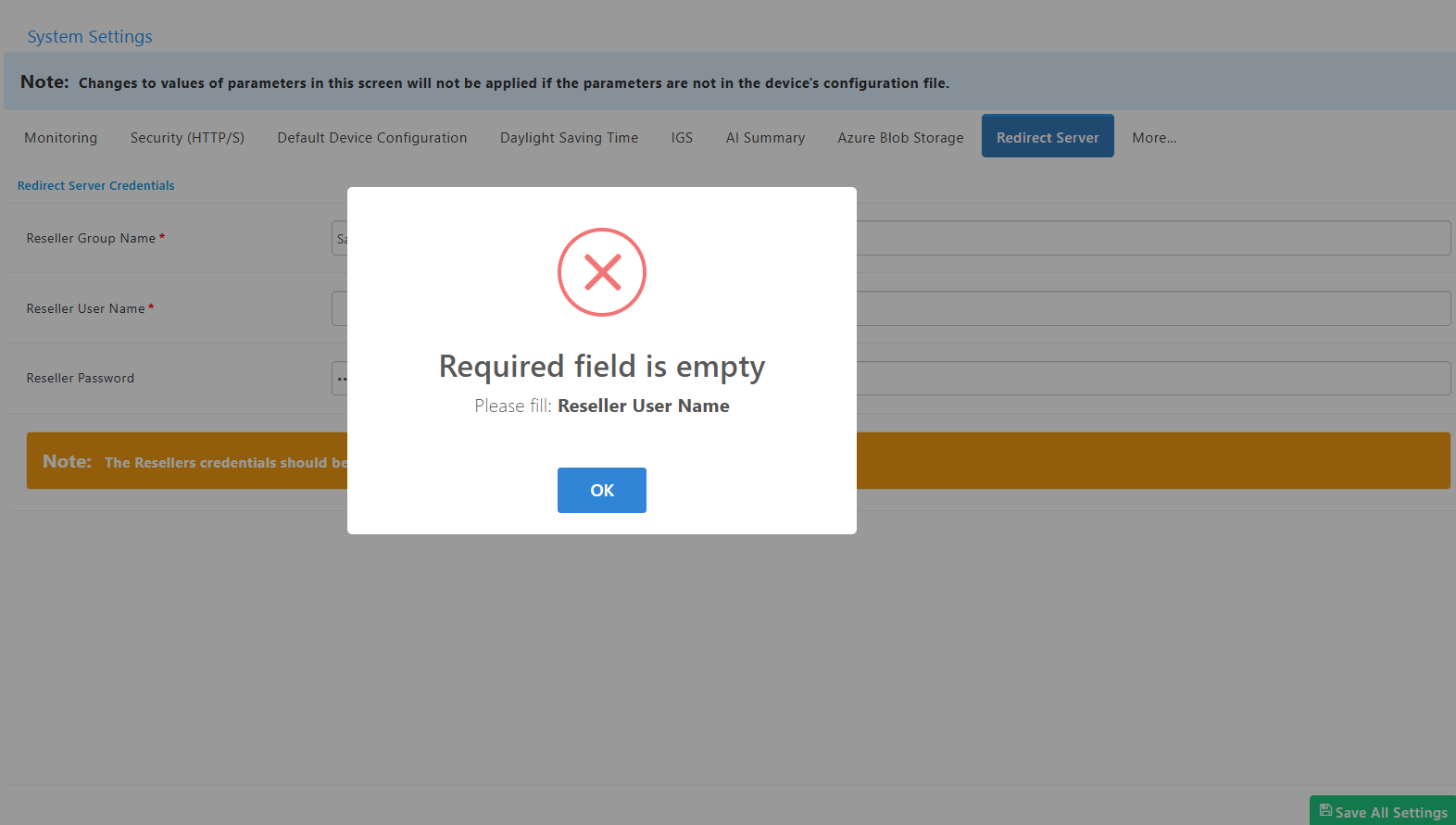 On the System Settings tabs, an error message is triggered when attempting to save if a mandatory field is not set. For example, the error message below is displayed because on the Redirect Server tab, the mandatory 'Reseller User Name' field is empty.
