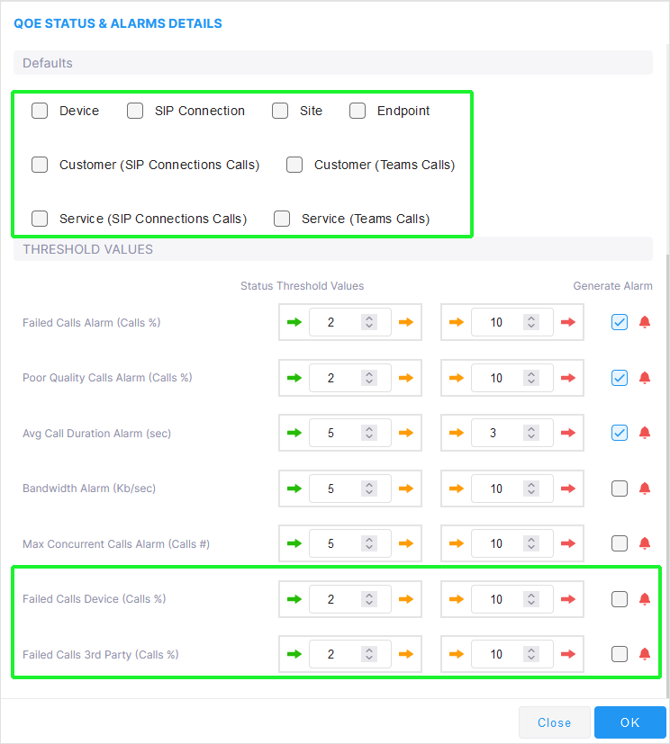 'Failed Calls Devices' and 'Failed Calls Third Party' thresholds have been added.