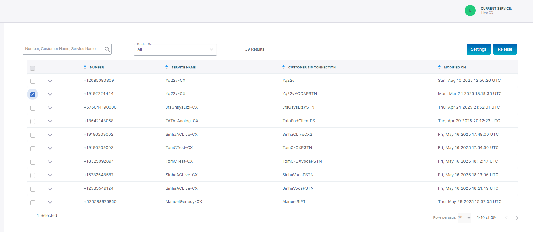 View and release managed DIDs: All numbers that have been loaded to customers are displayed in the Number Management page. You can view the details of these numbers including their attached Calling Profile and their CAC value. You can remove numbers from Live Platform as required. |