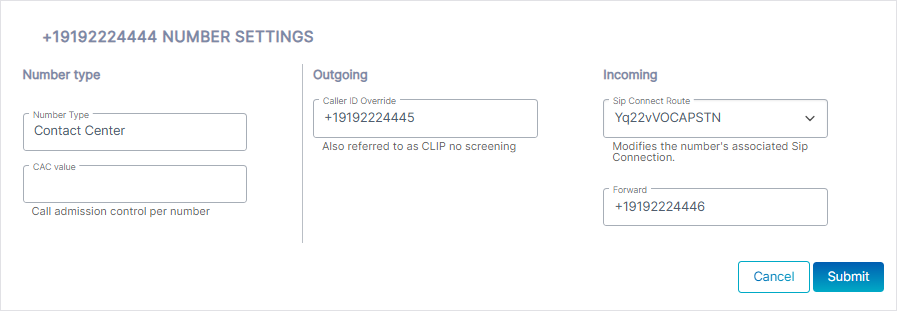CAC Values: Configure CAC value for Contact Center and Service Numbers which limits the number of concurrent call sessions for the number (not relevant for the 'User' number type). |